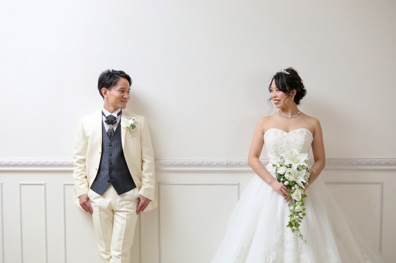 白い衣装に白い背景のショットも素敵ですよね! フルールの撮影では、スタジオ内のシーンに制限が無いので、様々な雰囲気の中撮影することが可能です。