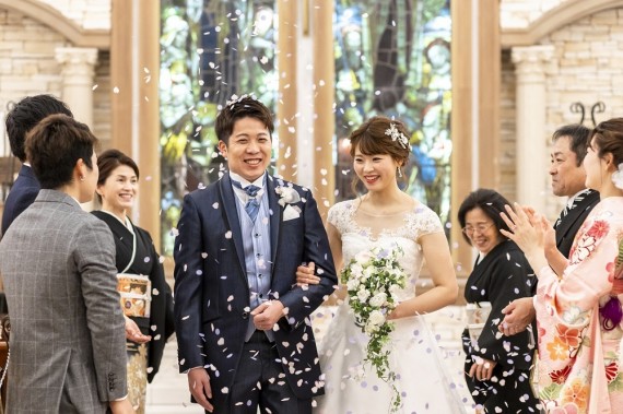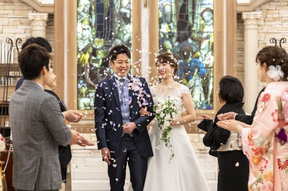 チャペルで皆様に囲まれたおふたりから、幸せオーラが溢れていますね♪