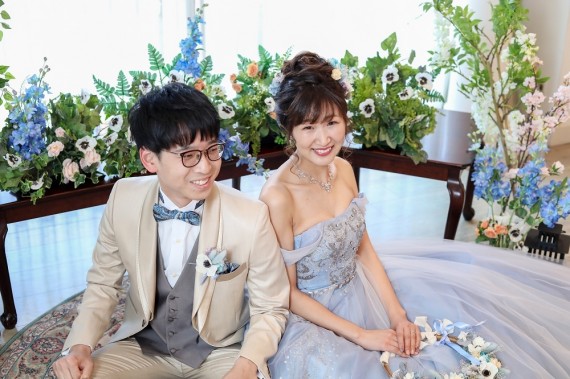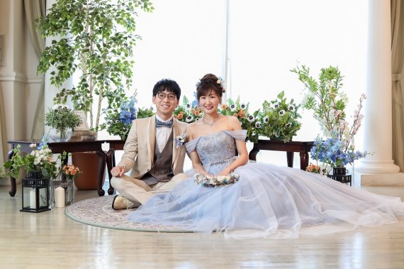 本日は、お花に囲まれてのおふたりのお座りショットをご紹介! 撮影スタートは緊張気味のおふたりでしたが、徐々に慣れてきて自然体な表情を見せてくれましたよ。