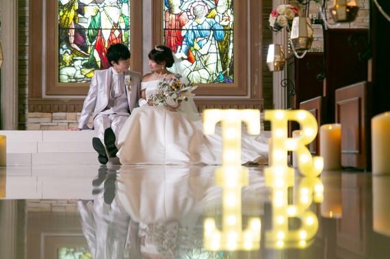 ひとつ前の投稿で使った同じイニシャルライトですが、撮影シーンが変われば雰囲気も違って見えますよね!チャペルの灯りを落とし幻想的な雰囲気で♪バージンロードに反射して映る光も素敵です!