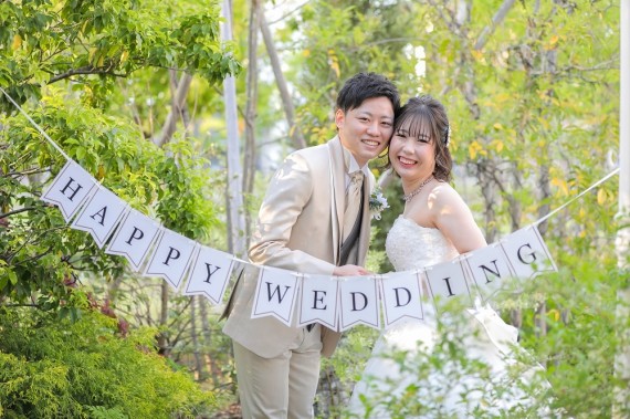 今回のアイテムはガーランド! おふたりを真ん中に『Happy Wedding』緑豊かなプライベートガーデンを使って笑顔いっぱいな一枚です♪ 池田 栞里
