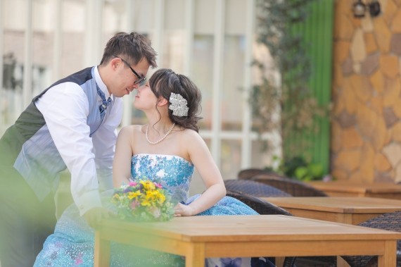 プライベートガーデンを使って撮影した一枚♪ ガーデンの緑をぼかして使ったふわっと幻想的な雰囲気のお写真。 お鼻とお鼻をくっつけたラブラブなおふたりにキュン♡ 池田 栞里