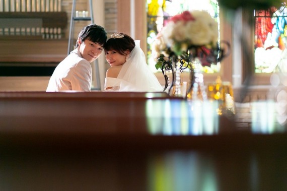 結婚式場を使ってフォトウェディング撮影ができるフルールでは、チャペルの撮影が一番人気です。バージンロードの先にある椅子に掛けてニッコリほほ笑むおふたり。フォトスポットがいっぱいあるので、おふたりの雰囲気やお好みに応じて撮影スポットをご提案させていただきます♪