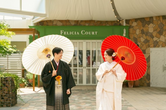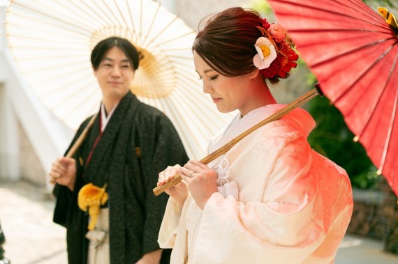 傘を持つと一気に和の雰囲気を高めてくれてドレスでは表現のできない趣を感じさせてくれます。