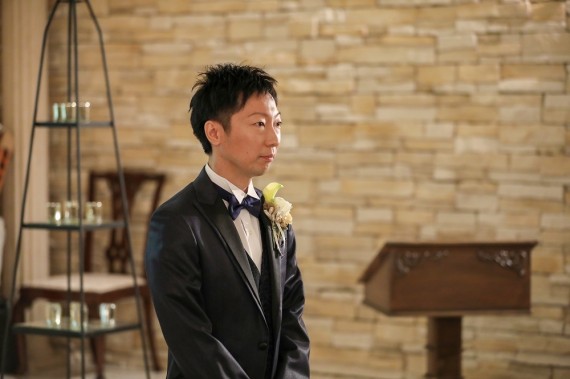 バージンロードの一番先で、ご新婦様の入場を待つご新郎様。