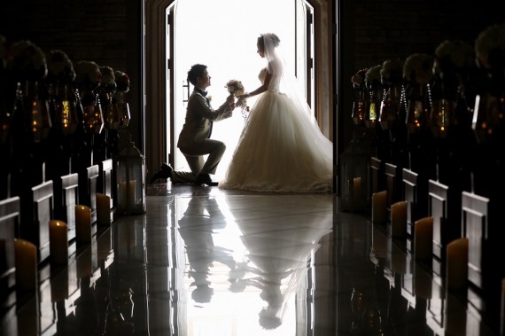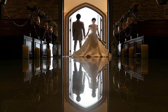 ④バージンロードのライトを利用してステンドグラスが映るオシャレな一枚