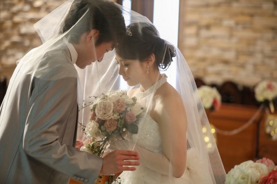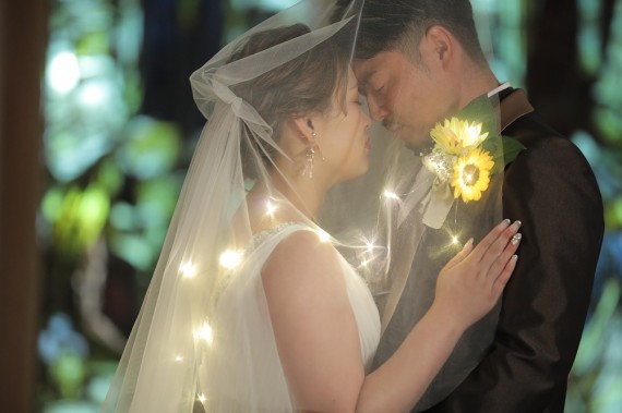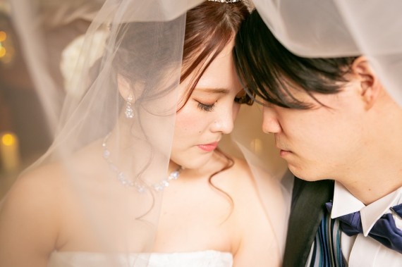 ウェディングベールを新郎新婦ふたりで被った『ベールインフォト』