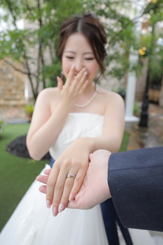 ご新郎様にはめてもらった指輪を眺めるご新婦様の幸せそうな表情がステキ