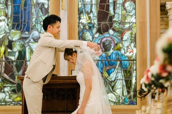 新郎が新婦のベールをアップすることで、ふたりを遮るものが何もなくなります。「これから先は、何も隠すことなく幸せな家庭を築いていきます」そんな意味も込められております。