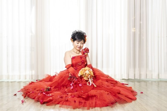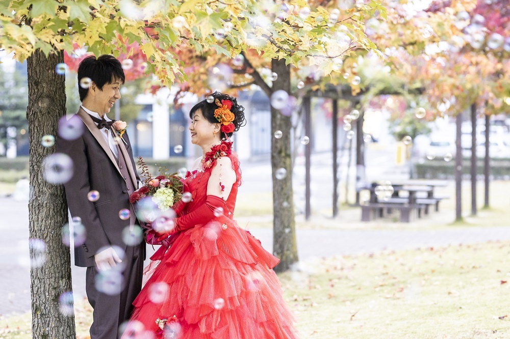 赤のドレスとブラウンのタキシードがよく似合ってます!