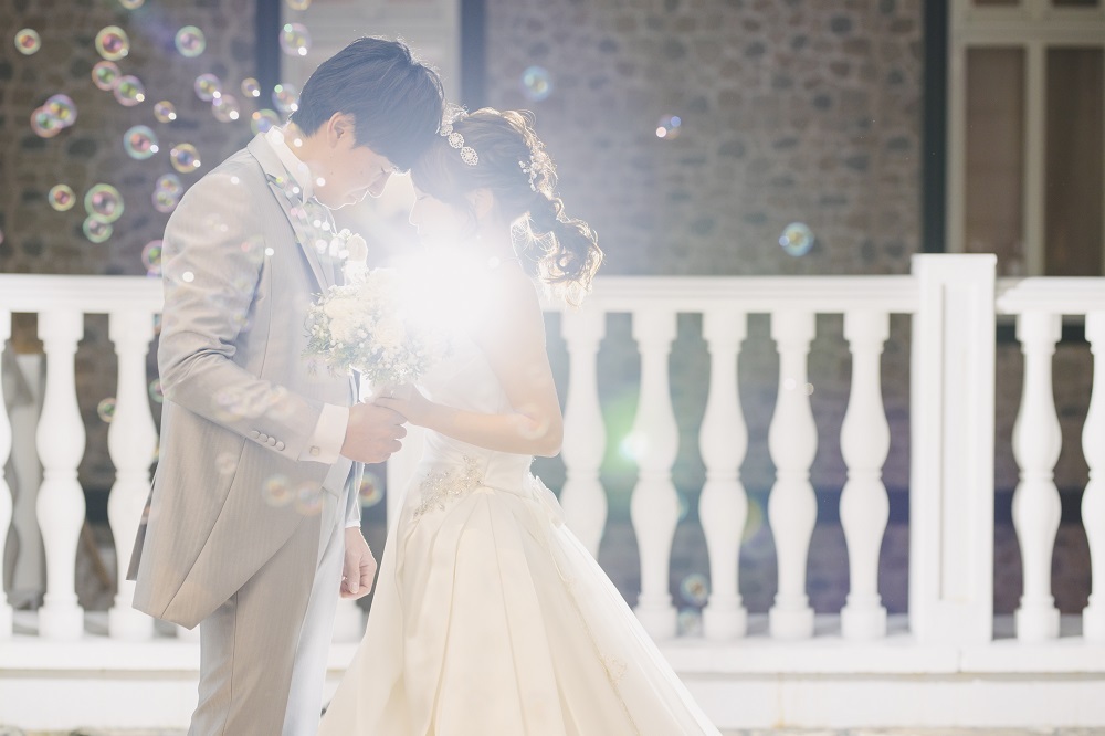 ライトで照らされたおふたりとふわふわと浮かぶシャボン玉、夜のシャボン玉もとっても素敵!