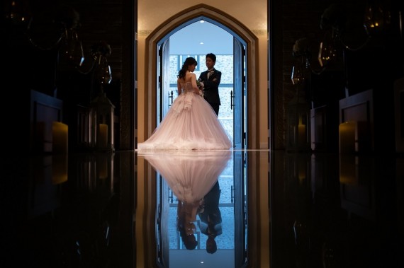 バージンロードにおふたりの姿が反射されるフルールのチャペルの特徴も活かしてお撮りします。
