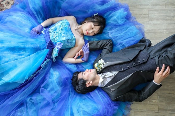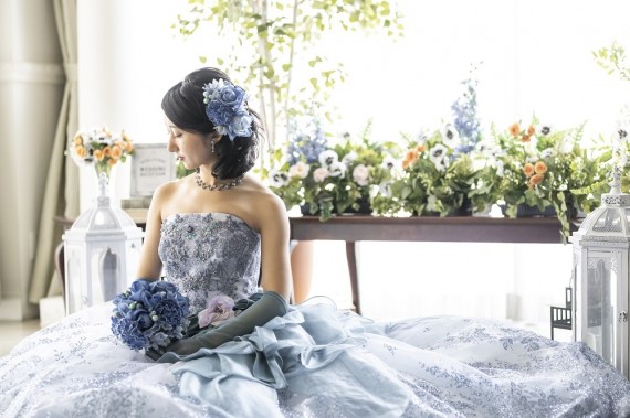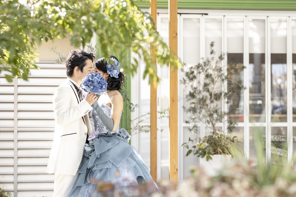 おふたりのお顔を少し隠して、ブルーグレーのようなシックなドレスで…