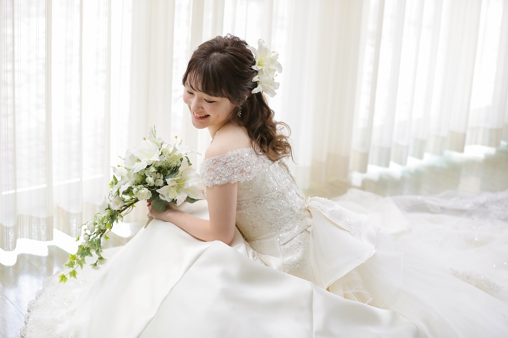 純白のウェディングドレスには、カサブランカなどの大輪のお花はいかがですか?