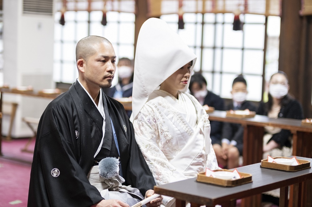 また白無垢を着る際に頭にかぶっている帽子、「綿帽子」にはウェディングドレスのベールと同じように、挙式が終わるまで新郎以外に顔を見せないという意味が込められています。