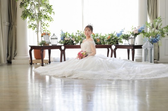 このように座ってドレスの広がりを魅せるショットはとても可愛らしいですよね♪プランナーや、撮影させていただくカメラマン、お支度から一緒にお手伝いさせていただくヘアメイクスタッフがドレスをより綺麗に映るようにサポートさせていただきます!