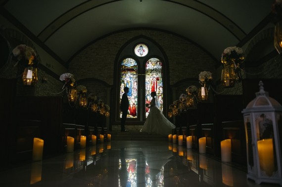結婚式で実際に使っているチャペルだからこそ、天井から床、壁までどこを移しても不自然にならないショットです。