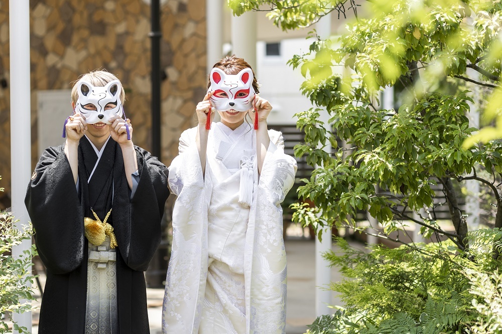おふたりで狐の仮面を当ててのお写真。