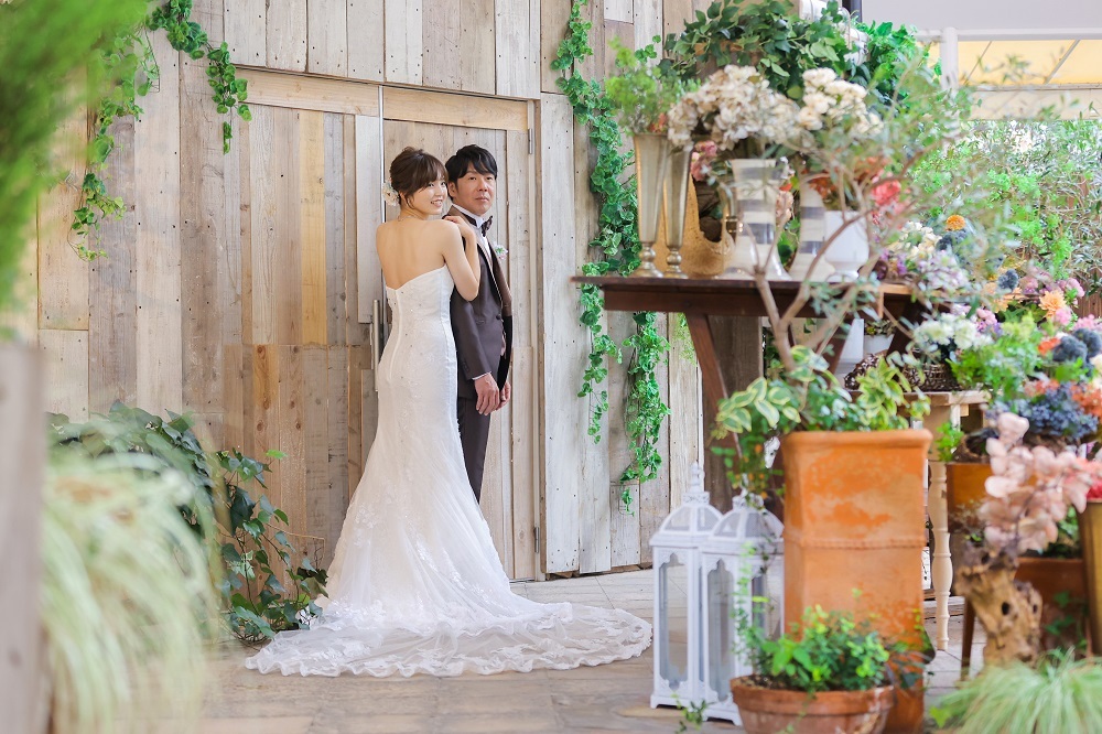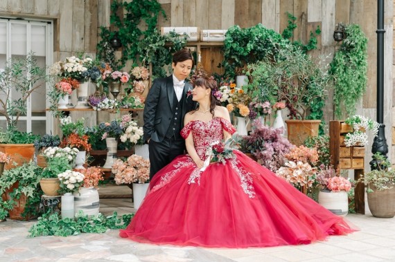グリーンや色とりどりのお花をバックにカラードレスがとてもよく映えますね♡