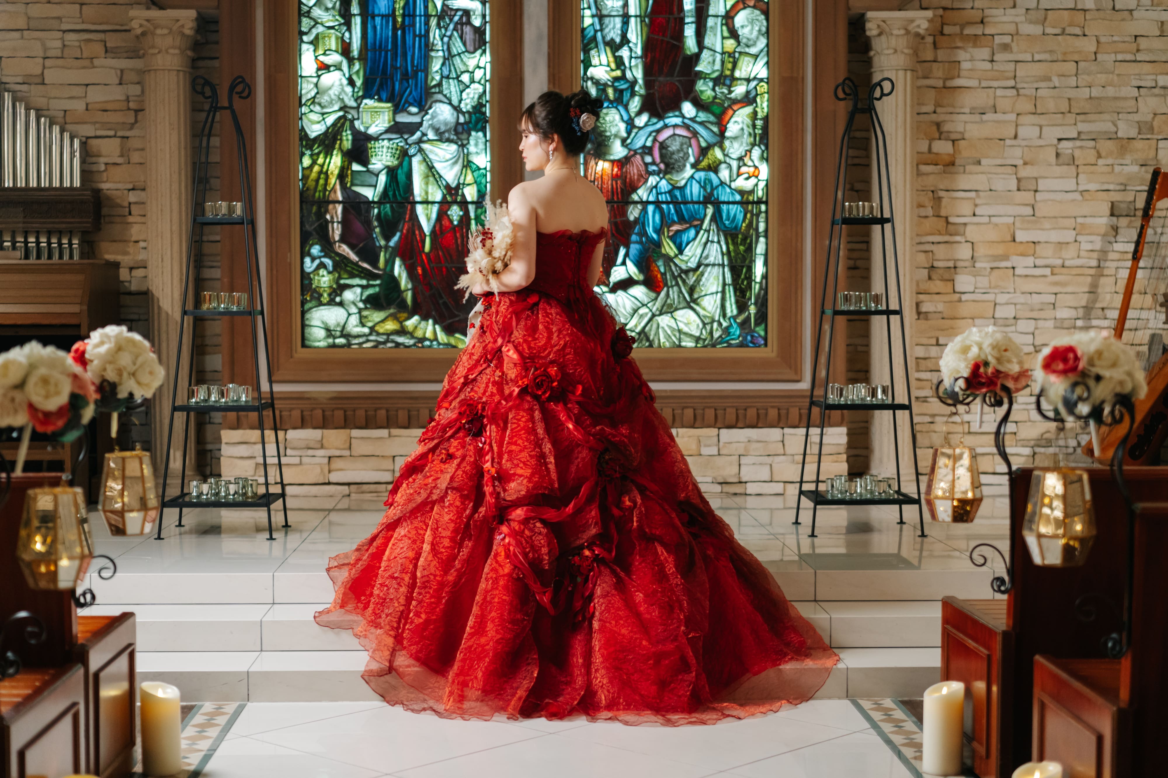 鮮やかな赤のドレスは派手過ぎるんじゃないの?と思われる方もいらっしゃいますが、実は着てみると華やかで想像以上にオシャレに決まります!
