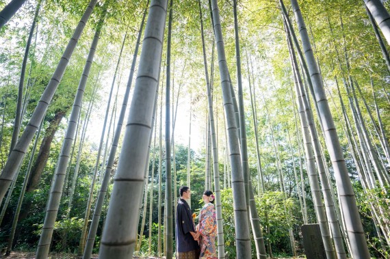 こちらのお写真はあえて広角レンズで撮影をしているので 高く伸びる竹のスケール感と、中心に立つお二人の姿が印象的です!
