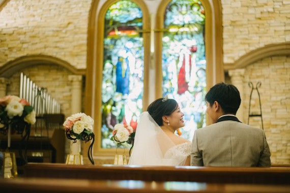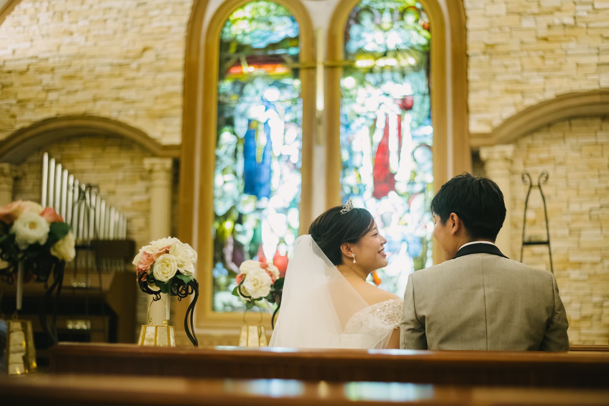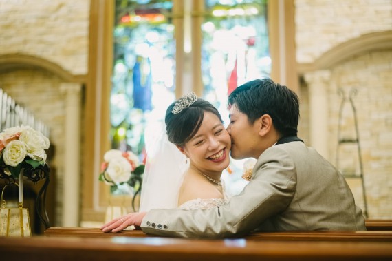 チャペルの椅子に座っているお二人の、不意打ちキスの瞬間♡