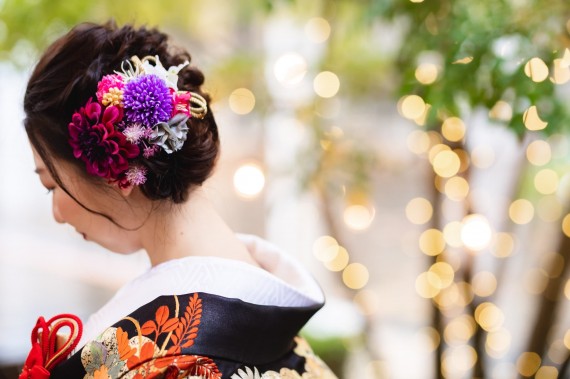 髪飾りには、赤だけでなく紫系の色味をプラスしました!