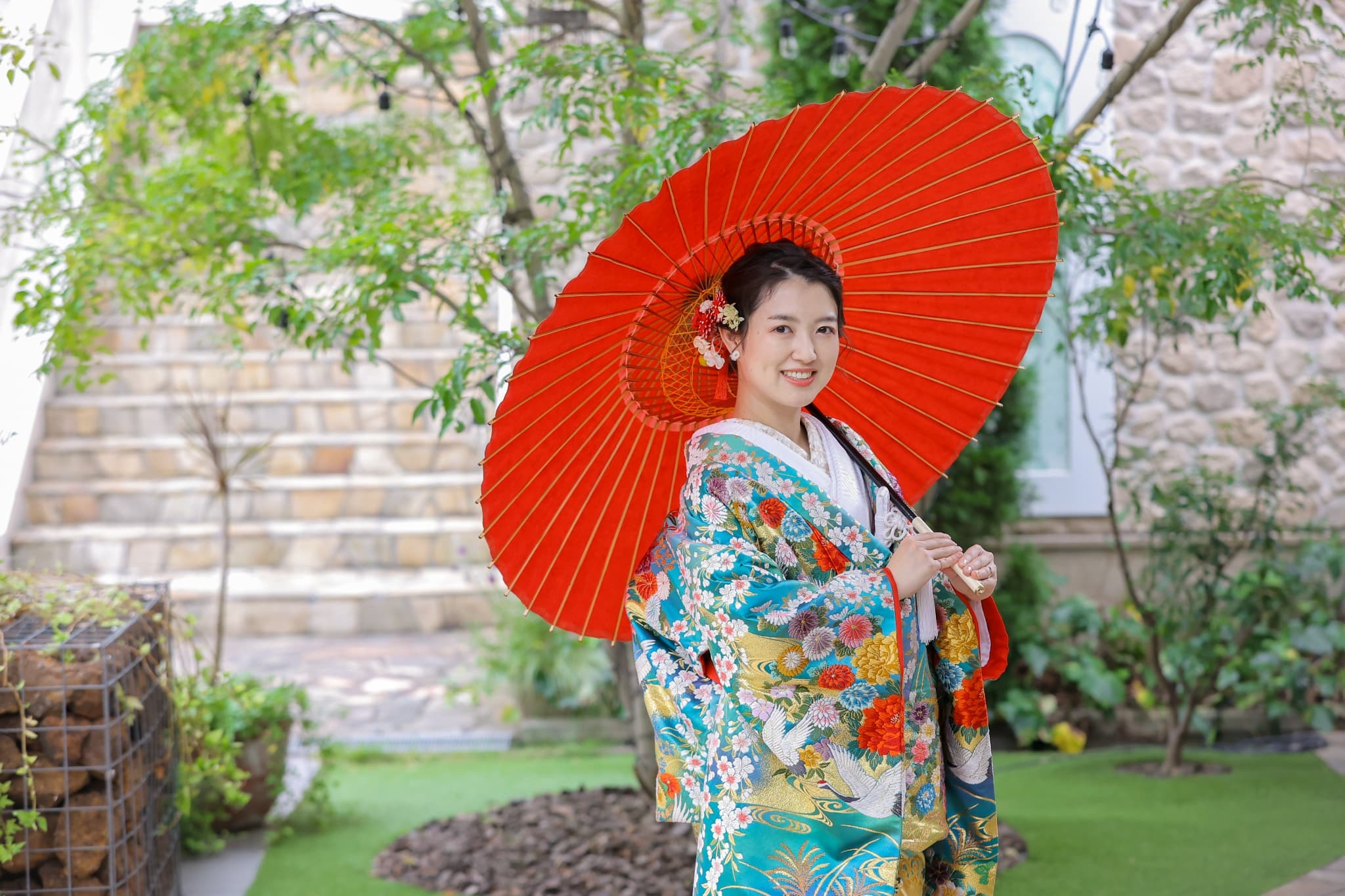 これまで、シックな黒の打掛や ふんわり優しげな白の打掛を取り上げてきましたが、今回は雰囲気が変わり、ポップなブルーの打掛をご紹介します!