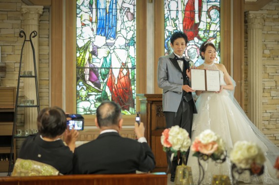 大切なゲストの皆様に見守られながら誓いを立てる、