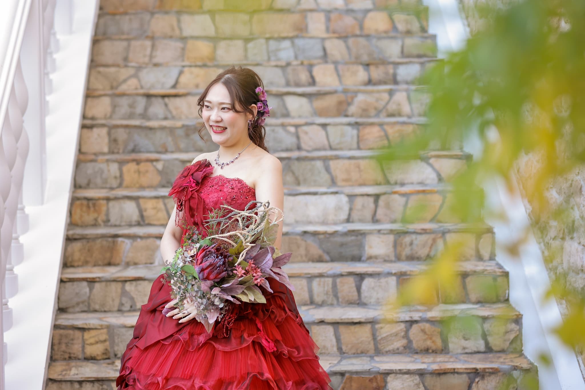 鮮やかな赤のドレスと組み合わせてオトナな雰囲気になります!