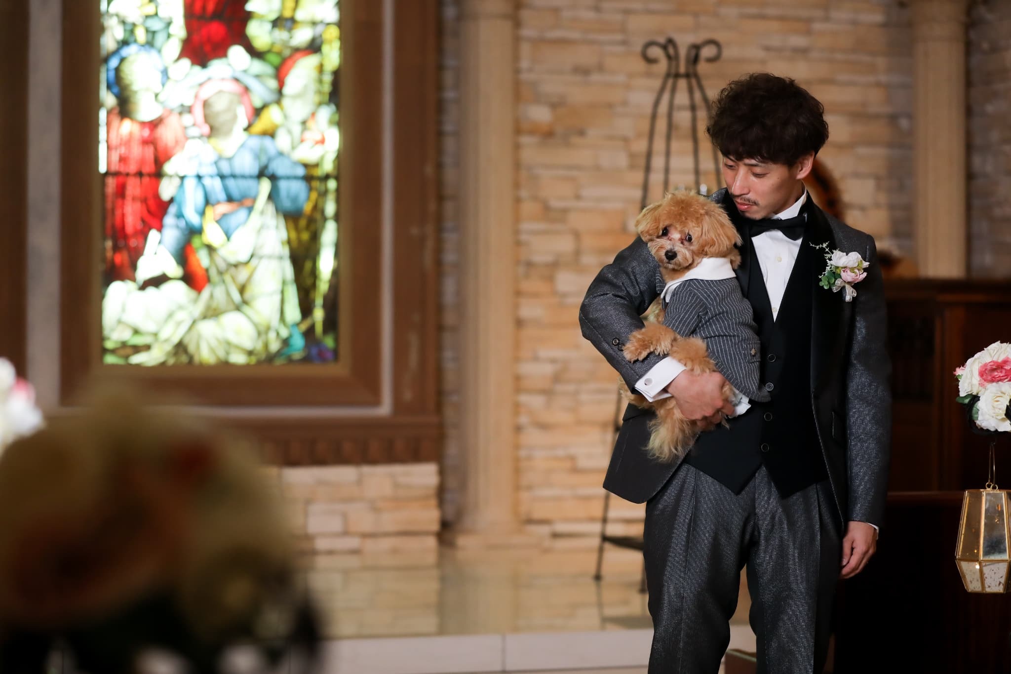 ワンちゃんとおそろいのタキシードで可愛さもある一枚です!