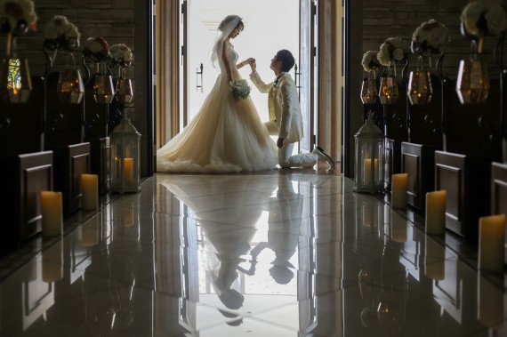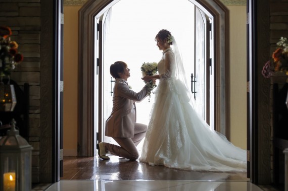 こちらは座っている新婦様に対して跪いてプロポーズ風のポーズを取っている新郎様!