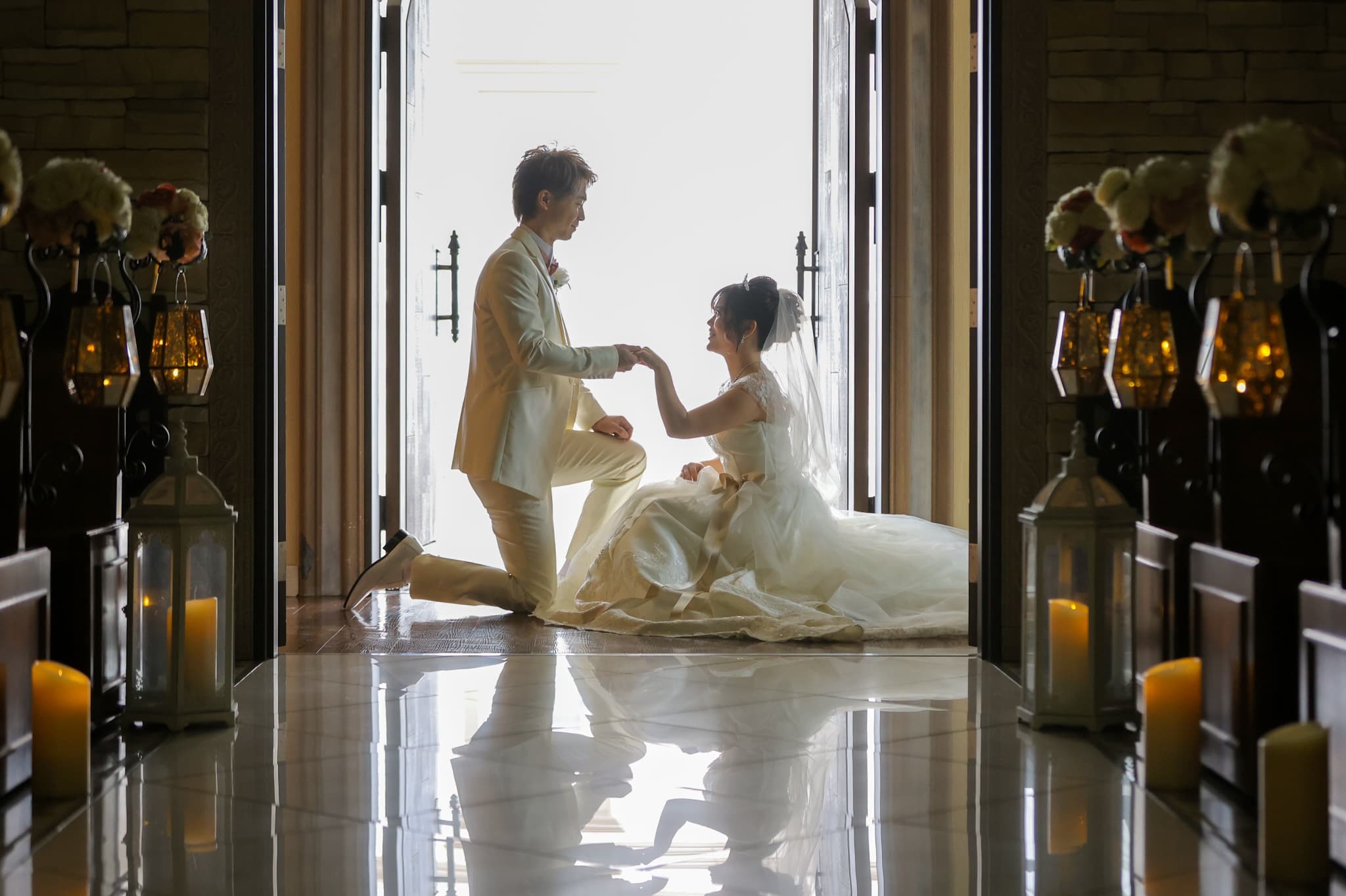 こちらは新郎様が跪いて新婦様と手を取り合う形のプロポーズ風ショット!