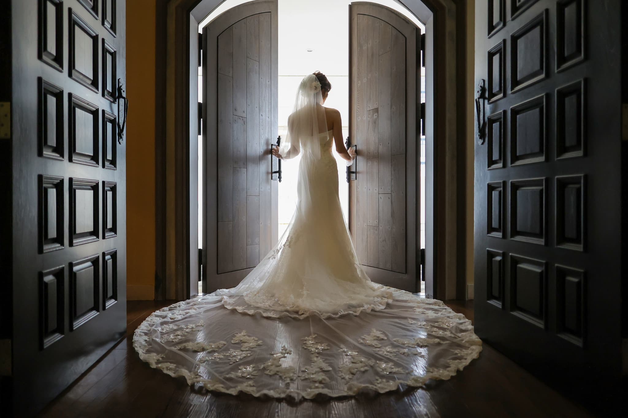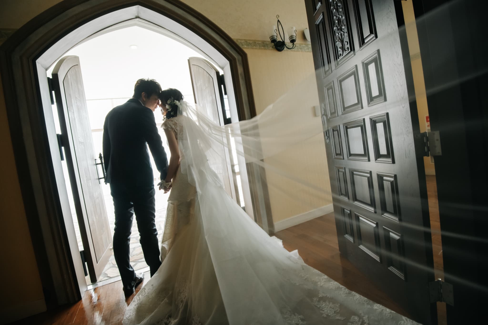 逆光によってシルエットフォトになったり、ドレスのトレーンやベールに光が反射してふんわりと輝く姿になったりと、扉一つでもバリエーション豊かなお写真を残せるのがメリットです◎