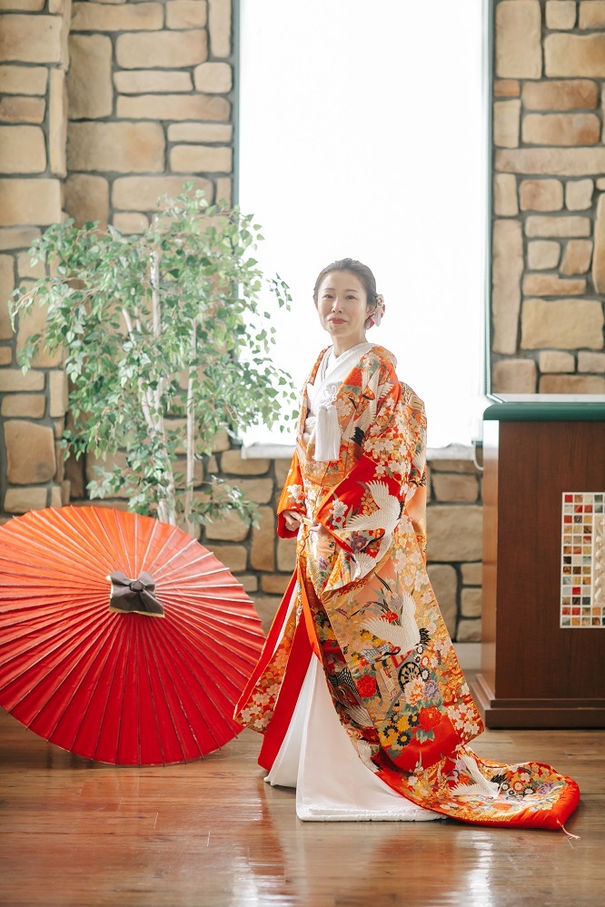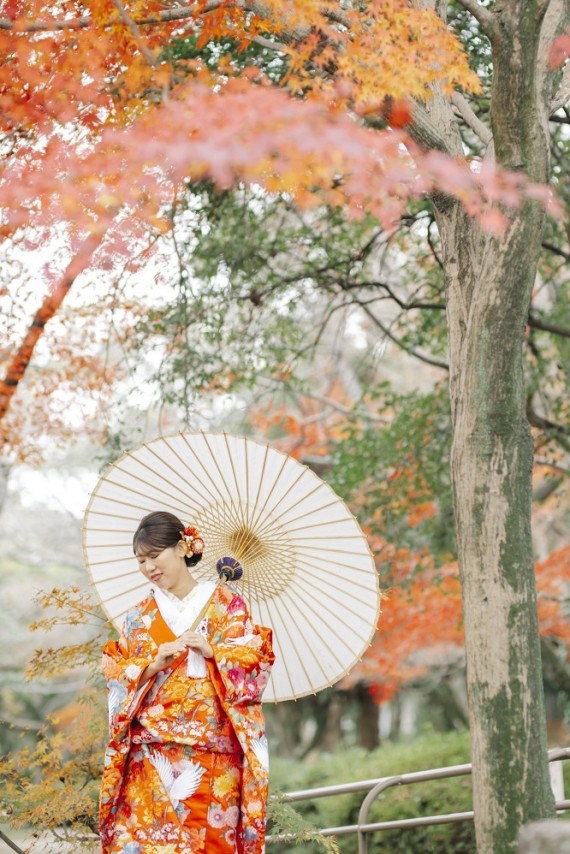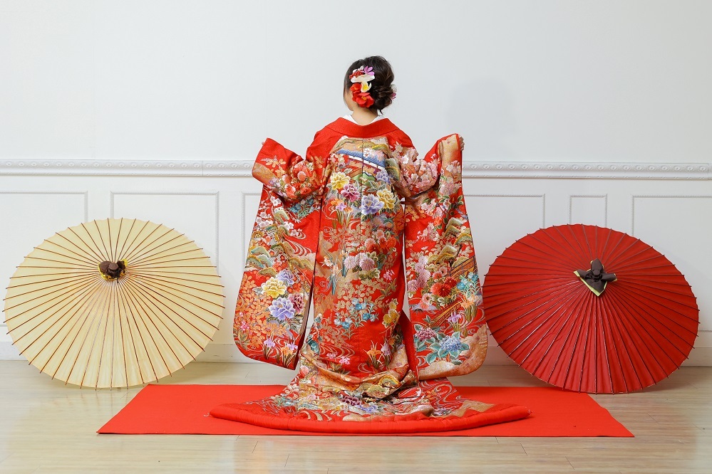 結婚というおめでたい感じも表すことができますし、洋装も一緒に撮影される方はウェディングドレスと色の対比があって、メリハリがつきますね。