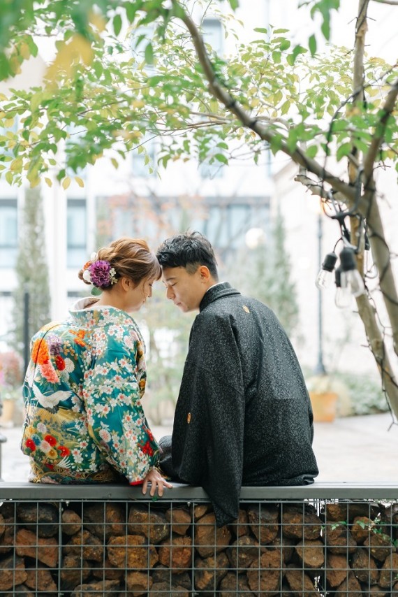 和装だと、正座をして…というイメージが強いかもしれませんが、ガーデンもベンチで座って撮影をするとこんなイメージに。