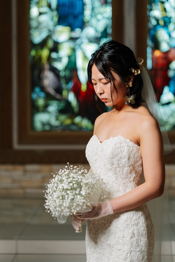 こちらのご新婦様はかすみ草ブーケとマーメイドラインのドレスでシンプルに仕上げた分、髪飾りは大きめのものを付けて、アクセントにしました。