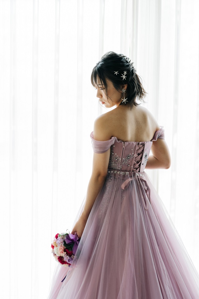 ショートヘアのメリットを活かして、お背中やデコルテが大きく空いているドレスにし、抜け感をプラス♪