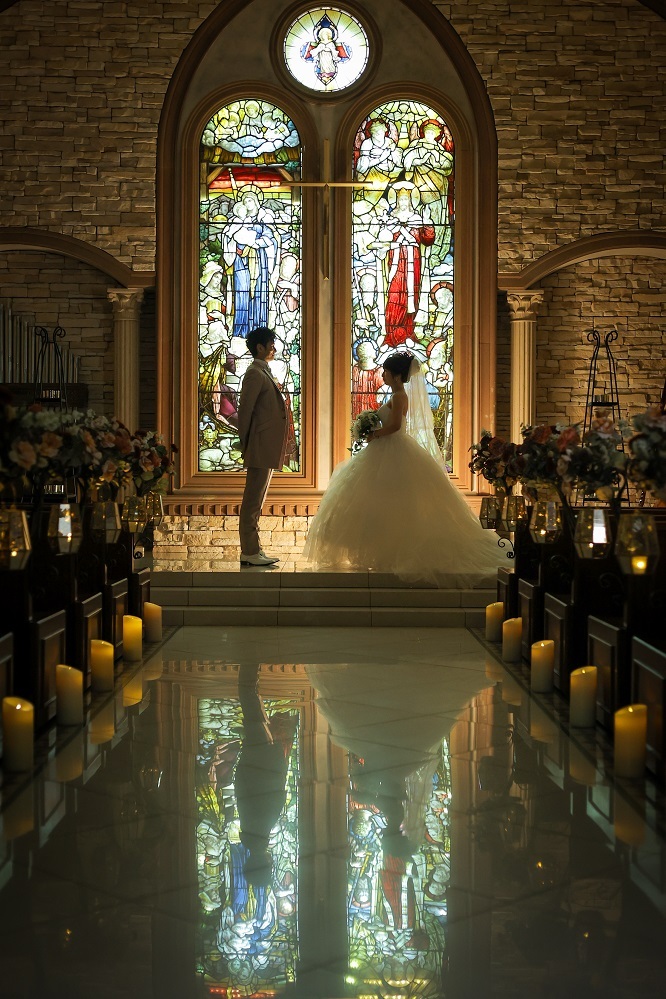 ステンドグラスにもおふたりの姿が映っていますね。