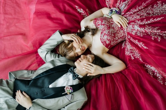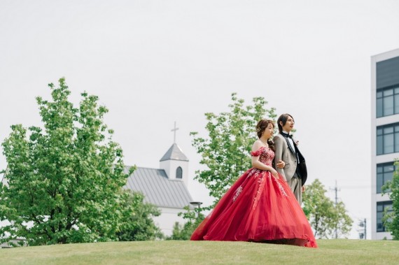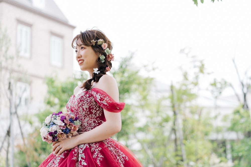 ルビーレッド色のドレス×自然のグリーンはお写真の映え間違いなし!