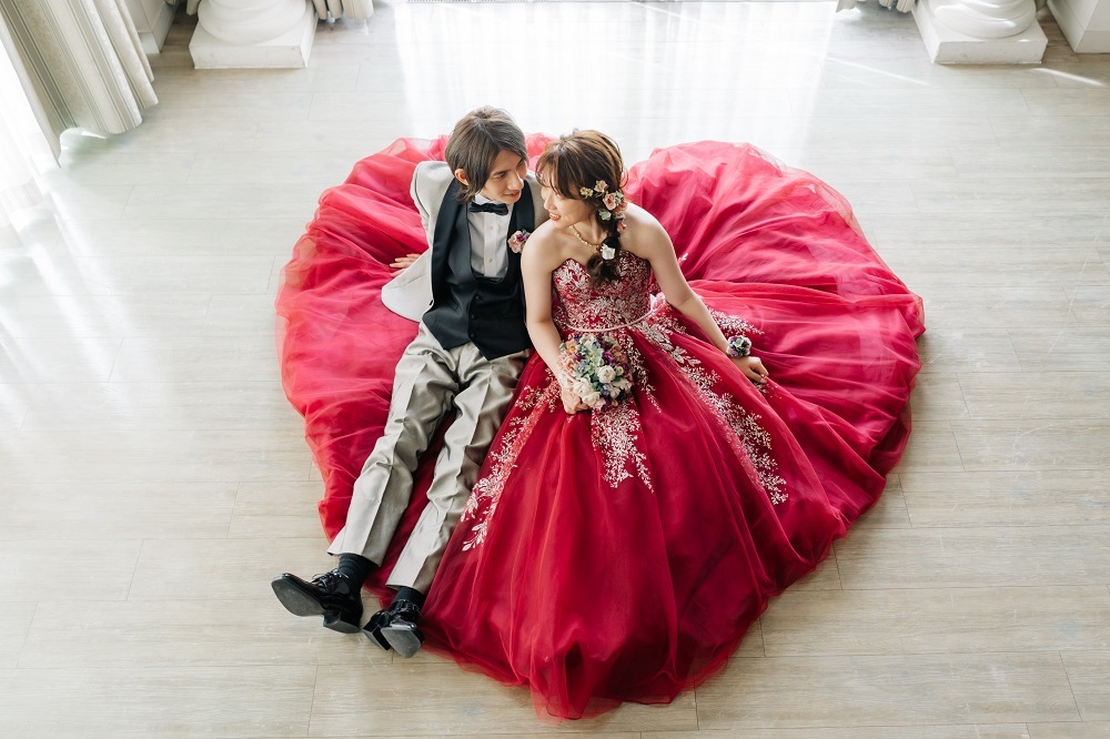 今回はルビーレッド色のカラードレスをご紹介いたしました。