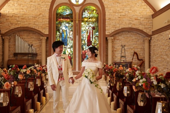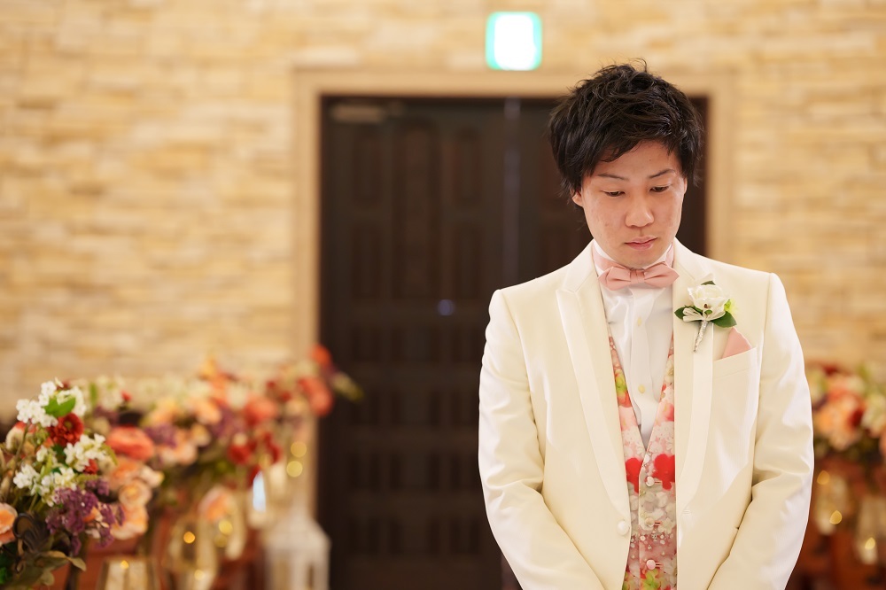 このお写真は、ファーストミートで、チャペルの中でご新婦様が入られるのを待っている様子です。