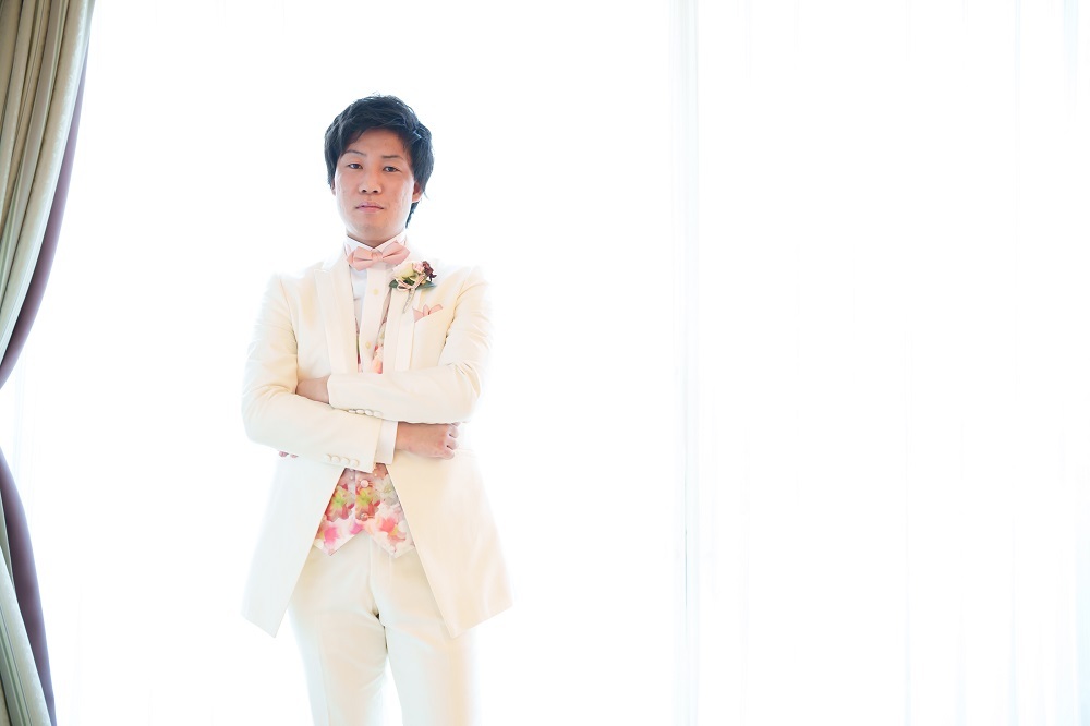 白タキシードは何にでも合うので、インナーシャツやベストを変えるだけで、こんなにも可愛らしい雰囲気に仕上がります。