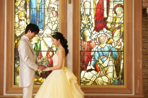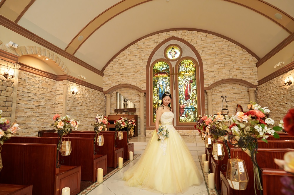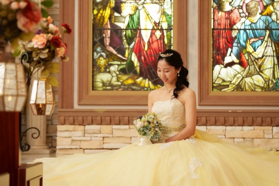 太陽光と照明で全く違った顔をお楽しみいただけるイエロードレス。