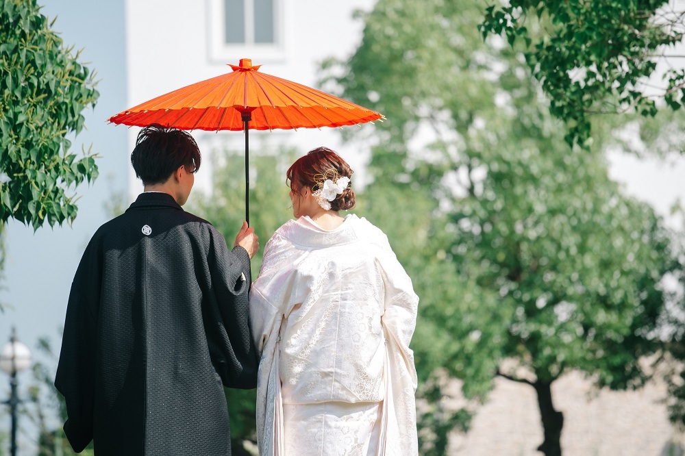 和傘を使って、おふたりの後姿を。