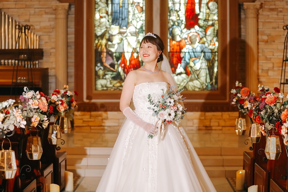 デコルテ~腕までが大きく開いているので、ドレスのレース感と相まって、軽めな、抜け感のある雰囲気に仕上がります◎