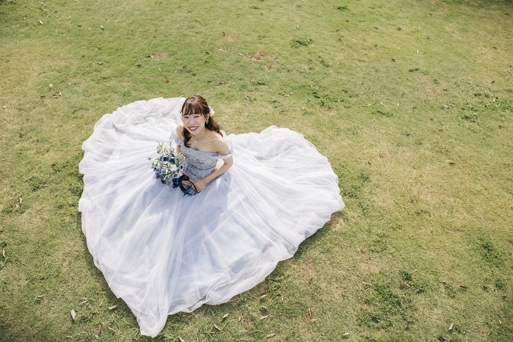芝生の上で♡を作って、ドレスのトレーン部分を活かしました。