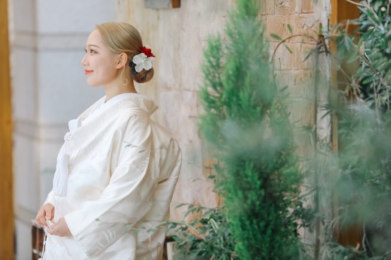 こちらはカラードレスを着て、当館のガーデンで撮影しました。