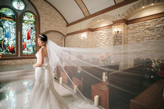 続いては、ウェディングドレスを着て撮影した、チャペルでの1枚。