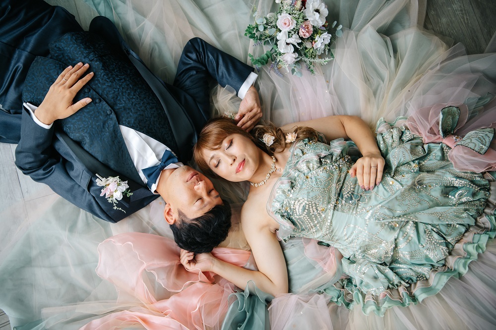 ドレスのトレーン部分を広げて、おふたりが寝転がるのも人気のショット。